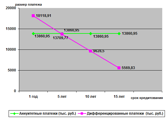 Таким образом, по приведенной выше таблицы и графику платежей можно сказать, что рассматриваемой мной семье, кредит на покупку квартиры площадью 54 кв.м. и сумму 990 360 руб. банк предоставить может, так как размер ежемесячных аннуитетных 13 860,95 руб. и дифференцированных 18 188,91 руб. платежей не превышает размера совокупного дохода 20 528 руб.