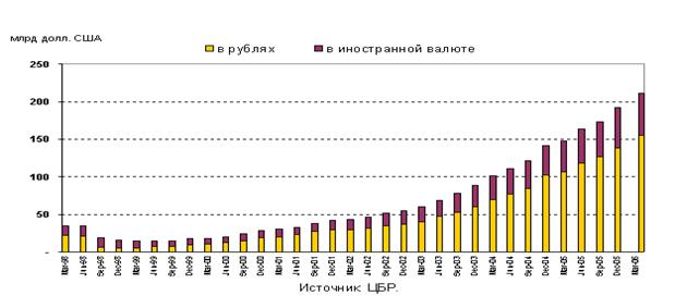 На фоне устойчивого макроэкономического подъема в последние годы объем кредитов, выдаваемых российскими банками, продолжает расти. В 2005 г. общий объем ссудной задолженности в банковской системе вырос примерно на 35%, а до этого, в 2004 г. — на целых 50% (см. диаграмму 1). В ближайшие годы высокие темпы роста, похоже, сохранятся под влиянием увеличения степени финансового посредничества и понижения процентных ставок по кредитам. Основание для такого вывода дает показатель роста объема кредитования (на 10% — до 210 млрд долл.) за первые четыре месяца 2006 г. Уровень внутренних кредитов частному сектору и государственным нефинансовым организациям, в процентах от ВВП, несколько повысился, но пока остается небольшим — 26% в конце 2005 г. и 28% (оценка) в 2006 г.