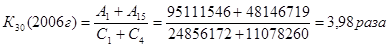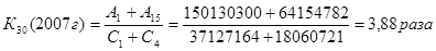 К30 - приоритетность направлений использования капитала. Оптимальное значение коэффициента 0,5-2,0 раза; фактические значения у банка соответственно равны: в 2005 г. – 3,1 раза, в 2006 г. – 3,98 раза и в 2007 г. – 3,88 раза. Это означает, что деятельность по использованию собственного капитала осуществляется должным образом.