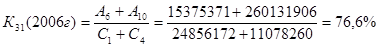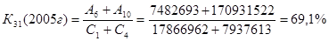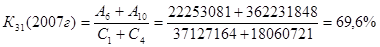 К31 - размер доходных активов, которые удается получить с каждого рубля капитала. Значение данного коэффициента в 2005 г. – 69,1%, в 2006 г. – 76,6% и в 2007 г. – 69,6%. Это говорит о том, что банк получает с каждого рубля собственного капитала 69,1%, 76,6% и 69,6% доходных активов соответственно по периодам.