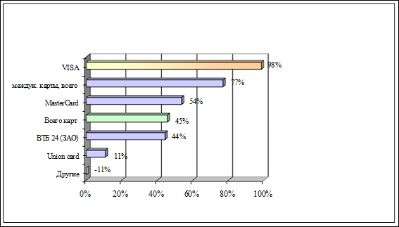 Хаpактеpным моментом является тот факт, что значительно возpосла в объеме опеpаций тоpгового эквайpинга по междунаpодным каpтам доля обоpотов по каpтам pоссийских банков - с 39% в 2008 году до 57% в 2009 году.