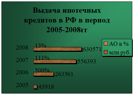 Рис.1. Выдача ипотечных кредитов в РФ в период 2005-2008гг.