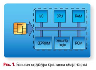 Кристалл смарт-карты (рис. 1) в базовой конфигурации состоит из центрального процессора (CPU), однократно программируемой памяти (ROM, ПЗУ), оперативной памяти (RAM, ОЗУ), энергонезависимой электрически перепрограммированной памяти (EEPROM, ППЗУ), логики обеспечения безопасности (Security Logic) и интерфейса ввода/вывода информации (I/O).