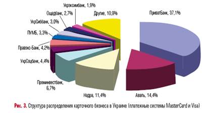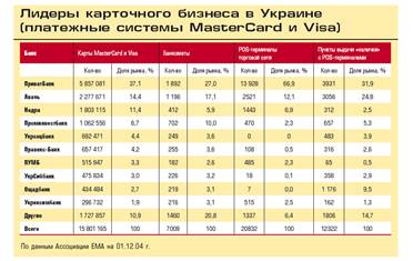 В Украине на 01.12.2004 эмитировано 15,801 млн. платежных карточек Visa и Master Card, установлено 7009 банкоматов, 20 832 торговых терминалов, функционируют 12 322 оборудованных терминалами пунктов выдачи наличных денег. Годовой оборот по карточкам Visa в Украине составил в 2003 г. около 16 млрд. грн., MasterCard — 11 млрд. грн. Кредитные карточки составляют около 4% общей эмиссии. Информация о лидерах карточного бизнеса на 01.12.2004 г. приведена на рис. 3 (см. также врезку «Лидеры карточного бизнеса в Украине (платежные системы MasterCard и Visa)»).