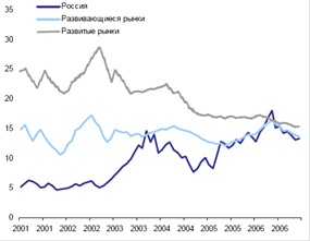 С 2001 года среднее соотношение цена/прибыль по российским акциям выросло почти втрое. Этот скачок выглядит ещё более впечатляющим, на фоне стагнации того же коэффициента по бумагам других развивающихся стран и его резкого снижения по акциям развитых рынков. В результате дисконт российских бумаг по текущему P/E почти исчез. Это ставит наш рынок в сильную зависимость от будущих темпов роста прибылей эмитентов и динамики мировых фондовых площадок.