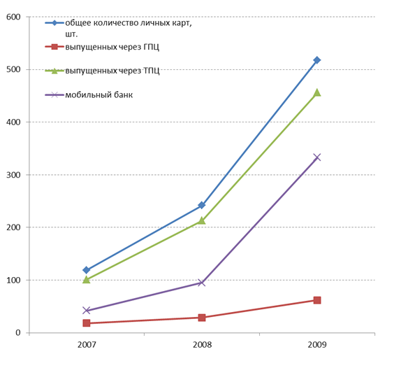 Данные таблицы 3 и рисунка 10, показывают, что наибольший рост наблюдается у услуги «Мобильный банк». Если в 2008 году по сравнению с 2007 годом прирост составил 121,4% (93/42*100%), то в 2009 году по сравнению с 2008 годом – уже 258,1% (333/93*100%).