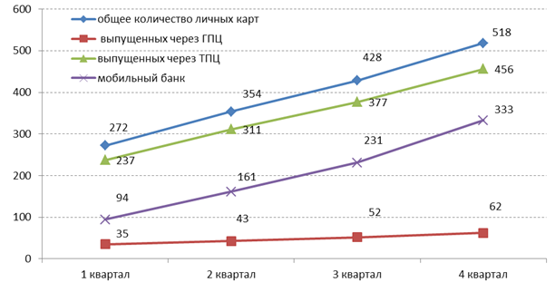 Общее количество выданных личных карт в 2009 году составило 276 шт. (518-242), при этом темпы прироста выдачи личных карт на конец 2009 года, по сравнению с началом составило +114,0% (276/242*100).