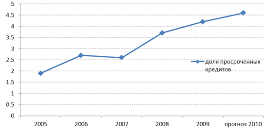 В России в 2005 году рост задолженности составлял 1,9%, в 2006 году доля просроченных кредитов физических лиц достигла величины 2,7%, к концу 2010 года рост задолженности прогнозируется в пределах 4,5- 4,8% (рисунок 4).