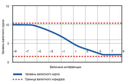 По мере приближения курса к границам допустимого диапазона колебаний регулятор начинает наращивать объемы валютных интервенции. При укреплении национальной валюты и приближении ее обменного курса к нижней границе денежные власти активно скупают иностранную валюту, а величина валютной интервенции (прирост валютных резервов ЦБ) принимает положительное значение. Ослабление национальной валюты и приближение ее обменного курса к верхней границе, напротив, заставляет массировано продавать иностранную валюту, и величина валютной интервенции принимает отрицательное значение. При возникновении угрозы выхода валютного курса за пределы валютного коридора величина интервенции стремится к бесконечности (на практике она, конечно, ограничена объемом валютных резервов). Аналогично выглядит функция ответной реакции ЦБ, если денежные власти не таргетируют обменный курс, а минимизируют волатильность его колебаний. В таком случае по вертикальной оси абсцисс будет отображаться волатильность валютного курса.