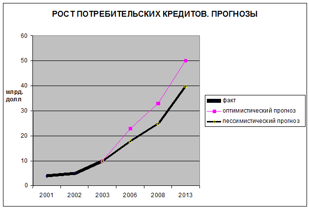 Согласно прогнозу Центра Экономических Исследований ММИЭИФП в 2005 году рынок потребительских кредитов показывает самые высокие темпы прироста за всю историю – около 115%. К началу следующего года кредитование физических лиц достигнет 1328351 млн.руб.[27]