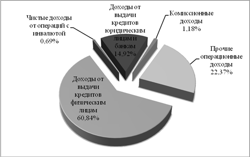 Из рисунка видно, что наибольший удельный вес в совокупных доходах банка занимают доходы от выдачи кредитов физическим лицам (60,84%), следующим по значимости являются доходы от выдачи кредитов юридическим лица (14,92 %) и 22,37% занимают прочие доходы банка.
