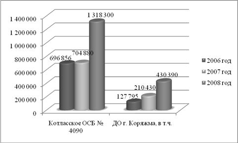 Из таблицы видно, что в целом по Ухтинскому отделению объем реализации лотереи в 2008 году составил 1 318 300 рублей, что на 621 444 рубля (или на 89 %) больше, чем составляет этот показатель в 2006 году.