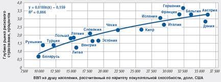 Рисунок 3 - Зависимость глубины рынка рискового страхования от ВВП на душу населения, рассчитанного по паритету покупательской способности, 2008 г.