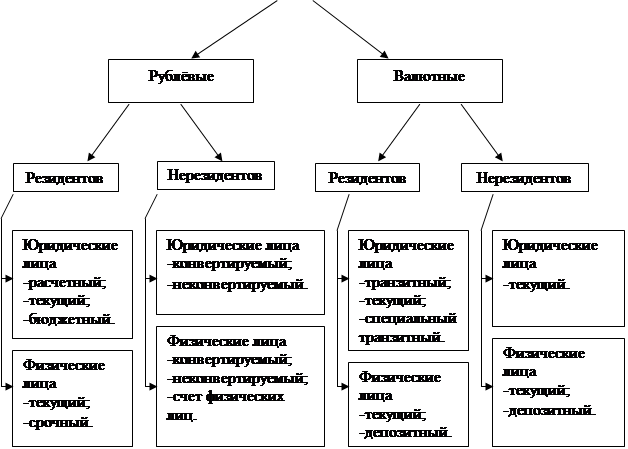 Из схемы видно, что в каждом уполномоченном банке открывается несколько видов валютных счетов каждому клиенту. Это связано с тем, что все операции юридических лиц, связанные с иностранной валютой проводятся с использованием того или иного счета. Виды операций и порядок ведения соответствующих счетов регулируется Центральным банком Российской Федерации.
