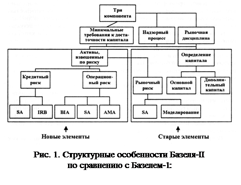 Что касается расхождений и изменений в базельских документах, то отметим, что в Базеле-1 выделены значимость и роль надзорного процесса в регулировании достаточности капитала каждого банковского учреждения. То есть формализация надзорного процесса приобретает особый вес, поскольку Базель-II позволяет наиболее эффективным банкам использовать вместо стандартизированных методов и единой классификации рисков системы внутренних рейтингов для расчета минимальных требований (рис. 1).