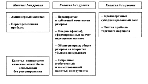 Контроль за соблюдением минимальных требований (1-й компонент) остался важнейшей составляющей Базеля-П. Капитал, определенный надзорными органами как источник покрытия неожиданных убытков, состоит из акционерного капитала и нераспределенной прибыли (капитал 1-го уровня, или основной капитал) и дополнительного капитала (капитал 2-го уровня). Банки могут привлекать и так называемый капитал 3-го уровня, включающий краткосрочные субординированные заимствования, которые при определенных условиях используются для соблюдения минимальных требований к достаточности капитала (рис. 2).