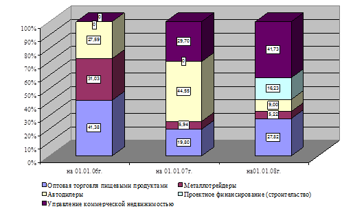 Кредиты корпоративным заемщикам составляют четверть кредитного портфеля банка. Темпы прироста объемов кредитования корпоративных заемщиков и в 2006 и в 2007 году примерно одинаковы - более 40% в год. За два года объем кредитования корпоративных заемщиков вырос почти вдвое. Количество заключенных с корпоративными клиентами договоров имеет тенденцию к увеличению: в 2007 году количество заключенных договоров превысило количество договоров, заключенных в 2005 году, почти в 2,5 раза. Структура выданных кредитов все время менялась. В 2005 году большая часть кредитов была выдана предприятиям оптовой торговли, кредиты на равные суммы были выданы металлотрейдерам и автодилерам. В 2006 году доля кредитов металлотрейдерам увеличилась. Меньше всего кредитов было выдано автодилерам. В 2007 году произошли изменения в структуре выданных кредитов. Больше всего было выдано предприятиям оптовой торговли пищевыми продуктами и управления коммерческой недвижимости. Меньше всего кредитов в 2007 году было выдано предприятиям-металлотрейдерам. Просрочка по возврату кредитов в 2005 году составила 2,78%, в 2006 году отсутствовала, в 2007 году достигла наибольшего значения - 4, 19% от суммы выданных кредитов. Анализируя доходы банка от кредитования корпоративных клиентов, важно отметить положительную динамику их роста. За два года доходы банка выросли почти на 200%, что в свою очередь вызвано ростом числа заключенных договоров. Предприятия почти всех отраслей продемонстрировали прирост доходов от их кредитования. Уменьшились за анализируемый период лишь доходы от кредитования металлургических компаний и компаний-автодилеров, что вызвано уменьшением сумм кредитов данным предприятиям.