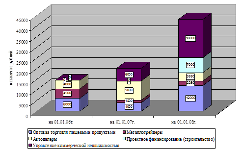 Из представленных в таблице данных видно, что структура доходов от кредитования ежегодно изменялась. В 2005 году более 40% доходов было получено от кредитования предприятий оптовой торговли пищевыми продуктами, более 31% доходов - от кредитования металлотрейдинговых предприятий, 27,6% доходов - от кредитования автодилеров. В 2006 году структура доходов существенно изменялась. Уже 44,5% доходов получено банком от кредитования автодилеров, 29,7% - от кредитования предприятий сферы управления коммерческой недвижимостью, 19,8% - от кредитования предприятий оптовой торговли пищевыми продуктами и лишь 5,94% всех доходов принесло кредитование металлотрейдинговых предприятий. В 2007 году более 41% доходов составили доходы от кредитования предприятий сферы управления коммерческой недвижимостью, почти 28% - от кредитования предприятий оптовой торговли пищевыми продуктами, 16,23% - от кредитования предприятий сферы проектного финансирования, лишь 9% доходов принесло кредитование предприятий-автодилеров и всего 5,22% доходов принесло кредитование металлотрейдинговых компаний. Структура доходов от кредитования графически представлена на рисунке 12. Анализируя доходы банка от кредитования корпоративных клиентов, важно отметить положительную динамику их роста. За два года доходы банка выросли почти на 200% (28630 тыс. руб.), что в свою очередь вызвано ростом числа заключенных договоров. Предприятия почти всех отраслей продемонстрировали прирост доходов от их кредитования. Уменьшились за анализируемый период лишь доходы от кредитования металлургических компаний и компаний-автодилеров, что вызвано уменьшением сумм кредитов данным предприятиям. Динамика доходов банка представлена на рисунке 13.