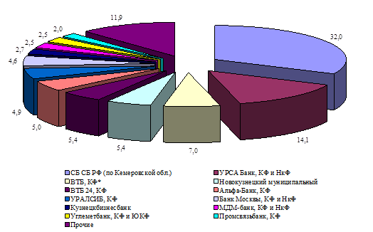 В таблице 2 представлены объемы ссудной задолженности по СФО на 01.01.08г. Как и в региональных активах, в ссудном портфеле большая часть (54%) принадлежала "крупнейшим" СБ СБ РФ, филиалам УРСА Банка и Банка ВТБ, а половину из оставшейся задолженности формировали филиалы ВТБ 24, Альфа-Банка, Банка Москвы и Новокузнецкий муниципальный банк. При этом наибольший прирост (примерно по 20% прироста регионального портфеля) обеспечили СБ СБ РФ и УРСА Банк. Значительный рост активных операций в 2007 году также продемонстрировали филиалы Банка ВТБ (около 13% регионального прироста), Банка Москвы (7,7%), ВТБ 24 (6,9%) и Альфа-Банка (6,6%), а лучшую динамику показали все те же "малые" региональные Кемсоцинбанк (+196%) и НОВОКИБ (+139%), а также филиалы Банка ВТБ (в 1,3 раза), новосибирского Банка "Алемар" (+112%) и Банка Москвы (+109%). По размерам ссудной задолженности за 2007 год свое положение улучшили филиалы Банка ВТБ (с 6-го на 3-е место), Банка Москвы (с 8-го на 6-е), Промсвязьбанка (с 10-го на 9-е), Банка "ВТБ Северо-Запад" (с 14-го на 10-е), ТрансКредитБанка (с 12-го на 11-е), Углеметбанка (с 13-го на 12-е), МДМ-банка (с 15-го на 13-е), а также региональный Кемсоцинбанк (с 23-го на 22-е). Доля филиалов МДМ-банка в объеме ссудной задолженности банковской системы СФО составляет 1,5% (рисунок 2).