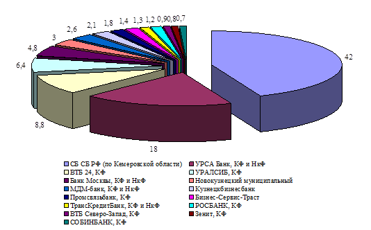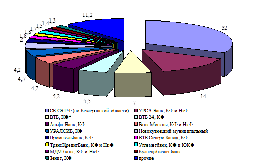 По объему средств населения на счетах (58 млрд рублей, или 16% средств населения СФО) банковский сектор Кемеровской области уверенно входит в тройку ведущих банковских систем Сибирского федерального округа и почти не уступает Новосибирской области (17,7%) и Красноярскому краю (16,7%). При этом почти 3/5 всех своих средств население Кузбасса доверило Сибирскому банку Сбербанка России. При этом половину оставшихся средств населения аккумулировали филиалы УРСА Банка и Новокузнецкий муниципальный банк. Значительные средства население также доверило Кемеровскому филиалу УРАЛСИБа, Кузнецкбизнесбанку и филиалам Банка Москвы (таблица 4).