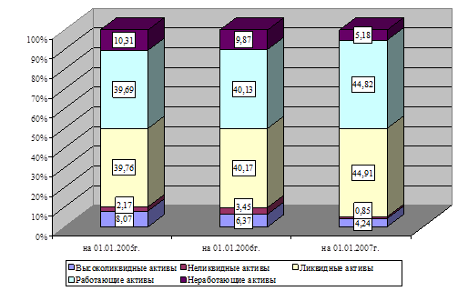 Незначительное увеличение резервов по ссудам свидетельствует о том, что банк выдает ссуды с повышенным уровнем риска. Снижение неработающих активов может положительно сказаться на доходности банка. Их доля также снизилась более, чем на 5%. Активы же банка увеличились за счет роста ликвидных и работающих активов. Незначительное снижение высоколиквидных активов свидетельствует об уменьшении платёжеспособности, а значительное увеличение ликвидных и снижение неликвидных активов положительно влияет на уровень ликвидности банка. Структура активов графически представлена на рисунке 6.