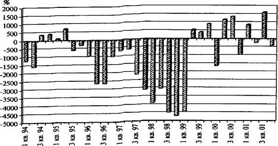 Это проявляется в достаточно наглядном виде, если сравнить квартальные показатели за 1999 год с данными второго полугодия 1994 и первого квартала 1995 года, когда режим курса был просто плавающим.