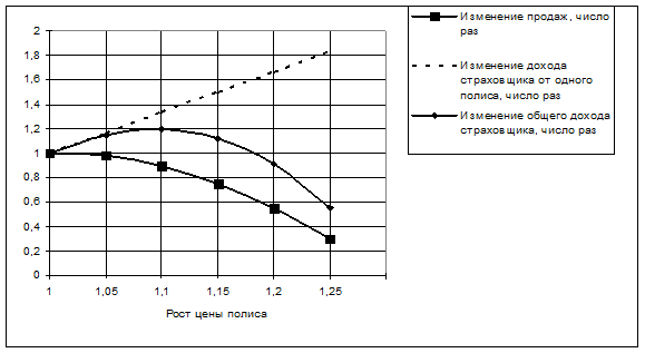 Из рисунка видно, что по мере роста стоимости полиса снижается число продаж, однако доход компании от каждого полиса растет. Дело здесь в том, что потребители по разному оценивают соотношение «цена-качество» услуги. Те, кто считает его неблагоприятным (это страхователи, гиперчувствительные к цене), уходят из компании, менее чувствительные к ней остаются.