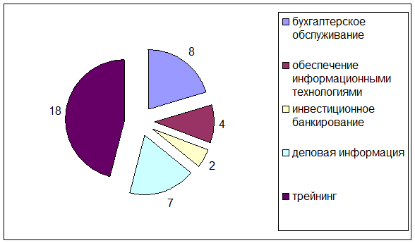 В целом было оказано такие услуги в 2004г. 39 компаниям по таким вопросам, как: бухгалтерское обслуживание, обеспечение информационными технологиями, инвестиционное банкирование, деловая информация и трейнинг. (рис. 3.1.) Например, были проведены трейнинги и бухгалтерское обслуживание таким компаниям как Opelwerk, Duesseldorf Flughafen, Quelle AG, инвестиционная деятельность - Sparkasse Bochum, Essen, Private Versicherung Ltd, Plus AG и тд.