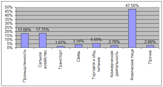Из всех кредитов, вложенных в экономику Таджикистана, в промышленность вложено 17,66%, в сельское хозяйство – 17,75%, в связь – 3,76%, в транспорт – 1,87%, в торговлю и общественное питание – 5,55%, в коммерческую деятельность – 2,78%, в здравоохранение и социальное обеспечение – 0,24%, физическим лицам – 47,5%, ЖКХ – 0,03% и прочие – 2,86% (рис.2.10 )