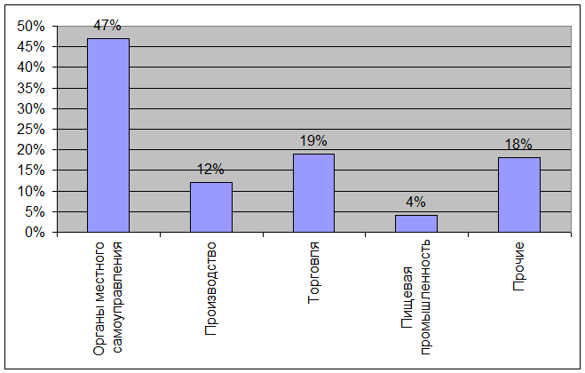 Из всех кредитов немецкого коммерческого банка Deutsche Bank, вложенных в экономику Росии, в органы местного самоуправления – 47%, в производство – 12,%, в торговлю – 12,%, в пищевую промышленность – 4%, и прочие – 18% были распределены. (рис.2.11.)