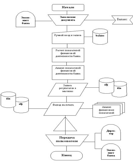 Информационное обеспечение состоит из следующих видов документов: входных, справочных, диалоговых и результативных. Решение задачи предполагает формирование следующих выходных документов: «Анализ финансовых показателей банка». Идентификатор документа: AFP. Форма представления: файл на ЖМД, машинограмма. «Динамические характеристики баланса». Идентификатор документа: DIN. Форма представления: файл на ЖМД, машинограмма. Для расчёта показателей выходного документа и других промежуточных данных используется исходная информация, содержащаяся в документе «Баланс», идентификатор: BALANS. Форма представления: файл на ЖМД, ручной документ.