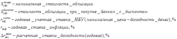 Облигации НДС – это государственные ценные бумаги казначейства Украины, эмитированные в 2004 году на сумму более 1 млрд.грн. для частичного погашения долга государства по возмещению предприятиям налога на добавленную стоимость за экспортированную продукцию. Облигации – процентные, алгоритм выплаты процентов зависит от уровня официальной инфляции в Украине, погашение облигаций по номиналу – через 5 лет. Поскольку получившие вместо необходимых денежных оборотных средств облигации предприятия нуждаются в деньгах сегодня, а не через 5 лет, возникает спрос на покупку банками облигаций с дисконтом. Поскольку в этой операции уже сегодня банки затрачивают денежные средства, то расчет коммерчески выгодного уровня дисконта осуществляется по формуле дисконтированной стоимости «пренумерандо» – при приведении всех будущих денежных потоков к моменту времени t=0 (2004 год) [ 27]: