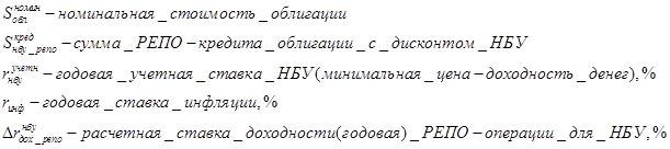 Банк, затративший средства на покупку облигаций, также не может ожидать 5 лет погашения их по номиналу, поскольку затрачены заемные оборотные средства, имеющие более краткий срок возврата, чем получение средств по дол-госрочным облигациям. Поэтому для банков целесообразно воспользоваться инструментом производной ценной бумаги - РЕПО-контрактом, т.е. получением рефинансирования от Национального банка Украины под контракт с залогом облигаций и их обязательным выкупом[38]. Сумма рефинансирования, ко-торую предоставляет Национальный банк на каждую облигацию НДС с учетом риска непогашения РЕПО-контракта и своей доходности от рефинансирования, рассчитывается по формуле , аналогичной формуле (5.1) :
