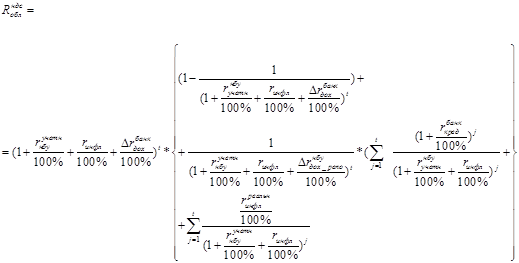 После преобразований выражения (5.5) получаем формулу для оценки рентабельности 3 этапов финансовой операции с облигациями НДС, имеющую 6 варьируемых переменных, которые регулируют выходной параметр эффективности – дисконтированную «пренумерандо» - рентабельность финансовых затрат банка .