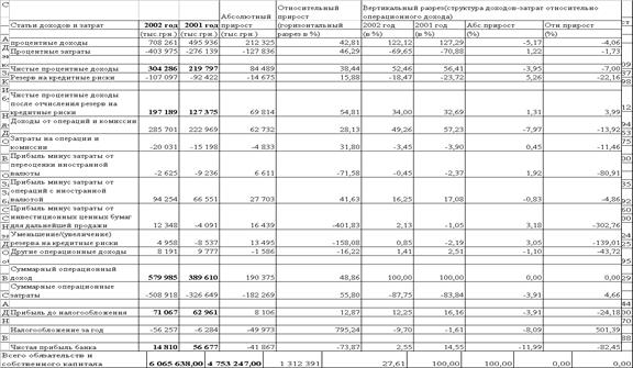Как показали “горизонтальный” и “вертикальный” анализ[33] динамики статей баланса и отчета о финансовых результатах АКБ “Приватбанк” за 2001 и 2002 года (табл.2.6-2.7):