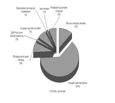 На рис.2.1 – 2.2 представлены структуры активов и пассивов АКБ «Приватбанк» и отдельных групп банков банковской системы Украины[44]. Структурная доля каждой группы агрегатов активов и пассивов представлена в виде процентной доли агрегата баланса к общей валюте баланса банка.