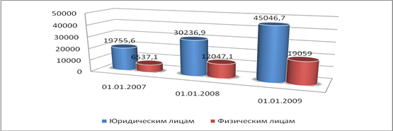 Основной удельный вес кредитного портфеля приходится на кредитование юридических лиц – 70,3% на начало 2009 года, однако прирост кредитного портфеля обязан в основном приросту кредитов, выдаваемых населению – темп их прироста составил 191,5%, который на фоне аналогичного показателя по кредитованию юридических лиц (128%) выглядит весьма внушительно. За анализируемый период кредиты юридическим лицам увеличились на 25291,1 млн. руб., а кредиты населению увеличились на 12521,9 млн. руб. (рисунок 2.3).