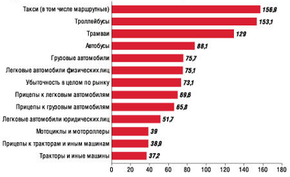 Большая и устойчивая дифференциация с точки зрения убыточности фиксируется и по типам транспортных средств: максимальные показатели (по такси и трамваям) превышают средние значения в 2,2–2,6 раза, минимальные (мототранспортные средства и тракторы) – на 60–80% ниже среднерыночного показателя. Высокий и стабильно сохраняющийся разброс в показателях убыточности в зависимости от территории преимущественного использования и типа транспортного средства свидетельствуют о несбалансированности системы тарификации ОСАГО.