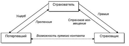 При урегулировании страхового случая при страховании ответственности важной особенностью является отношение в треугольнике между страхователем, страховщиком и потерпевшим (рисунок 10).