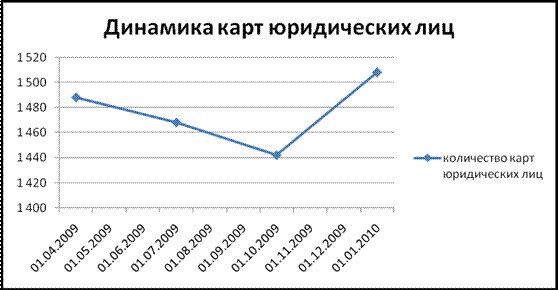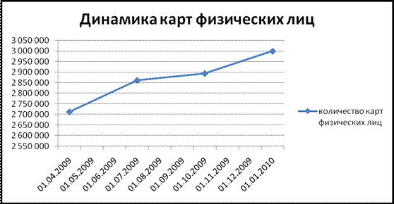 Взглянув на график динамики карт юридических лиц, можно сказать, что вследствие экономического кризиса доля карт у юридических лиц сократилась, так как многие организации оказались в неблагоприятной экономической ситуации и вынуждены были приостановить либо завершить свою деятельность. К концу 2010 года экономическая ситуация на рынке начала улучшаться, открывались новые организации, доля карт увеличилась. Рынок карт юридических лиц является мало освоенной нишей, я считаю, что необходимо увеличить внимание к данному контингенту, выработав нужную стратегию.