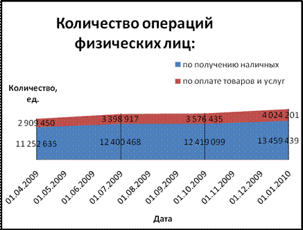 Проанализируем количество, динамику и специфику операций, совершенных на территории России и за ее пределами держателями банковских карт, эмитированных кредитными организациями и их филиалами, зарегистрированными на территории республики Татарстан. Общее количество карт по данным Банка России в республике Татарстан на 01.01.2010 г. составляет 3 млн., из них 2 млн. 999 тыс. – находятся в пользовании у физических лиц, и лишь 1 508 карт у юридических лиц. По сравнению с началом 2009 года общее количество карт выросло на 9,57%, карт у юридических лиц - на 1,33%, у физических лиц - на 9,57%. Из чего следует, что банковские кредитные карты больше используют физические лица, а рост карт в пользовании у юридических лиц незначетелен,долю карт юридических лиц необходимо увеличивать. Динамику банковских карт можно проследить на рисунках 2.4. и 2.5.