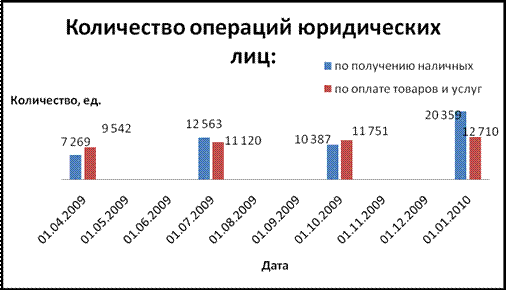 Количество операций по картам юридических лиц намного меньше, но состав операций такой же: операции по снятию наличных превосходят операции по оплате товаров и услуг в среднем на 21%.