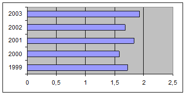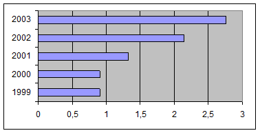 В то же время вырос удельный вес кредиторской задолженности: с 39,8% на 01.01.2002 до 56,5% на 01.01.2003. В абсолютном исчислении кредиторская задолженность увеличилась не столь существенно—на 1 085 398 тыс. рублей, или 19,4%. Кредиторская задолженность в валюте баланса на 01.01.2002 составляла 4,6%, на 01.01.2003—5,6%.