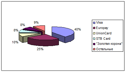 - корпоративным – для юридических лиц с назначением доверенного лица или нескольких доверенных лиц, которые будут распоряжаться счетом в пределах персонального лимита или без него с единой или несколькими карточками. Расчетно-кассовое обслуживание клиентов по операциям с использованием выданных им банковских карт может осуществлять только та кредитная организация, чей логотип и (или) наименование присутствуют на лицевой стороне этих карт. Наличие логотипов других кредитных организаций не допускается.Кредитная корпоративная карта – это банковская карта, которая позволяет держателю, уполномоченному юридическим лицом, осуществлять операции в размере предоставленной эмитентом кредитной линии и в пределах расходного лимита, установленного эмитентом в соответствии с условиями договора с клиентом, согласно перечню разрешенных операций.Для получения корпоративной банковской карты организация должна открыть в банке-эмитенте счет и заключить договор, который предусматривал бы проведение расчетов по счету с использованием банковской карты.Наибольшей популярностью среди пользователей пластиковых карт в Российской Федерации пользуются международные пластиковые карты ViSa (40%) и Europay (25%), которые принимаются по всему миру в более чем 120 странах мира (см. рис. 2). пластиковый карта расчет платежный