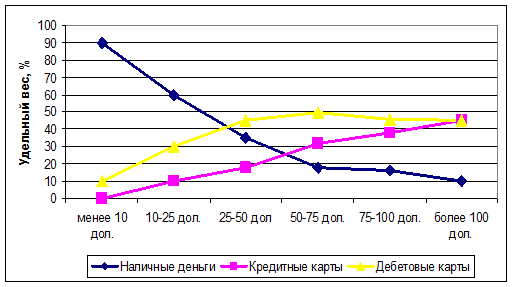 Доминирующее положение наличных денег в структуре платежных инструментов связано также с психологическим аспектом: население привыкло рассчитываться наличными деньгами и не представляет себе существования без них. По данным канадских исследователей, если размер трансакции сделки менее 10 дол. США, то 90% плательщиков предпочитают оплату наличными деньгами, и только когда размер трансакции превышает 50 дол. США, находится достаточное количество (65%) желающих использовать платежные карты см. рис. 3).
