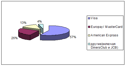 В настоящее время пластиковый бизнес - это более 1,3 млрд. выпушенных карт. Ежегодный мировой оборот превышает 3 трлн. долл. Платежные карты принимаются более чем 20 млн. торгово-сервисных предприятий. Около полумиллиона банковских отделений, предоставляющих услуги, проводят операции с платежными картами, а число банкоматов превысило 700 тыс. Наряду с локальными (национальными) системами всё более широкое развитие получают международные системы расчетов с использованием платежных карт. Основная часть мирового рынка пластиковых карт контролируется двумя крупнейшими компаниями - Visa International и MasterCard International. Если разделить весь мировой рынок пластиковых карт на сферы влияния основных игроков - платежных систем, то получится следующая картина: на платежную систему Visa приходится около 57%, на Europay/MasterCard примерно 26%, на American Express - порядка 13%, и на другие (включая DinersClub и JCB) - 4%.