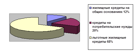 Как видно из рис.2.1 наибольший удельный вес в кредитном портфеле физических лиц занимают льготные жилищные кредиты (68%), остаток задолженности по кредитам на приобретение жилья на 01.01.2006 составил в национальной валюте 20,2 млрд. руб. или 12% от общего остатка задолженности по кредитам населению. Объем жилищных кредитов в иностранной валюте за последние 2 года увеличился более чем в 5 раз, и на 01.01.2006 остаток задолженности равен 40,8 млн. долл. и 0,9 млн.EUR [32, с.28].
