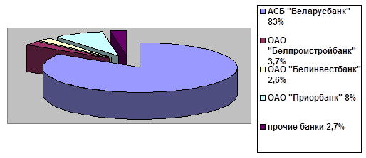 Из рис.2.2 видно, что безусловным лидером на рынке кредитных услуг, предоставляемых населению, является АСБ «Беларусбанк». При этом значительный удельный вес ОАО «Приорбанк» по сравнению с остальными банками свидетельствует об активизации его деятельности в направлении розничного кредитования.