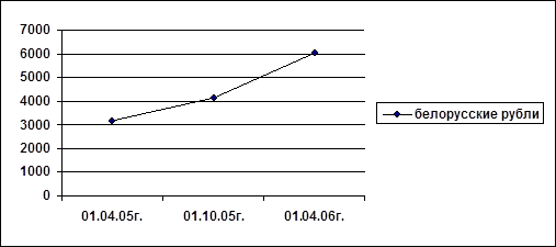 Отметим, что вклады населения в белорусских рублях в период с 01.10.2005г. по 01.04.2006г. росли более интенсивно (темп роста составил почти 1,5), чем в период с 01.04.2005г. по 01.10.2005г. (темп роста – 1,3). Это связано с интенсивно проводимой работой филиала по привлечению в конце 2005 года средств физических лиц на новый выгодный вид вклада в белорусских рублях «Калядны» сроком на 4 месяца.