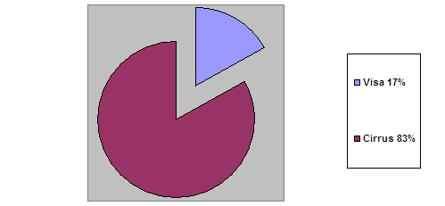 Новогрудский филиал N 416 АСБ «Беларусбанк» проводит активную работу с физическими лицами в плане открытия карт-счетов и выдачи пластиковых карточек. На 01.04.2005 года филиалом было выпущено 1366 штук карточек (Cirrus Maestro), и действовали 5 терминалов на предприятиях торговли и сервиса, принимающих оплату по карточкам за товары и услуги. За год по состоянию на 01.04.2006 года количество эмитированных пластиковых карточек увеличилось в 4,4 раза и составило 6044 штуки(в том числе-Cirrus Maestro – 5015 штук (83%) и Visa Electron – 1029 штук(17%)) (рисунок 8); количество терминалов для принятия оплаты по карточкам возросло до 14.
